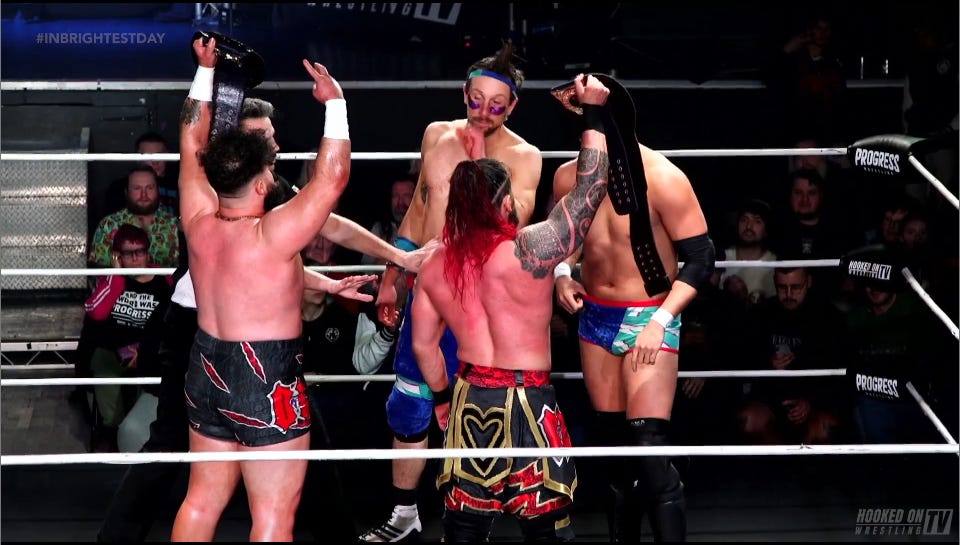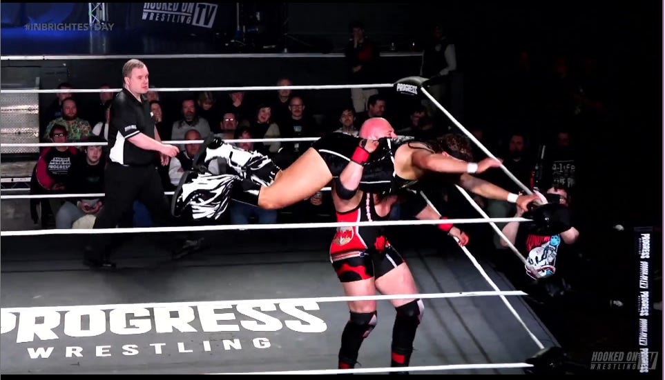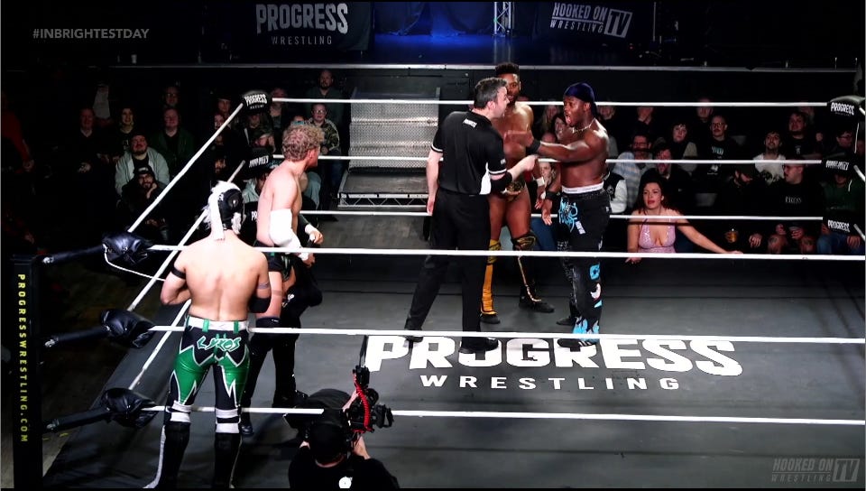 The continued breakdown of Lykos Gym, and the aftermath of the big schmozz at the last show which saw open discord between DeReiss and Kid Lykos. DeReiss and Oku teamed on a PROGRESS adjacent DEFY show at Mania week back in Philadelphia but this is their first time together in the PROGRESS proper. Lykos isn’t especially dressed to wrestle until he takes his jacket off. Across three entrances and the slow start to the match this is the first dip in the shows pacing. Not in a bad way, although Lykos is entirely in the dark when he heads to the floor. Classic shithousery from the ‘Shitwolf’. Actual wrestling breaks out once Lykos II takes over. Some clever detailing from Lykos working behind his own partners back. The general pace of the action is very high, very fluent. DeReiss and Oku have some miscommunication which leads to Oku getting knocked into Amira on the outside. This opens things up for Lykos to hit DeReiss with the unprotected elbow guard for a cheap win.
