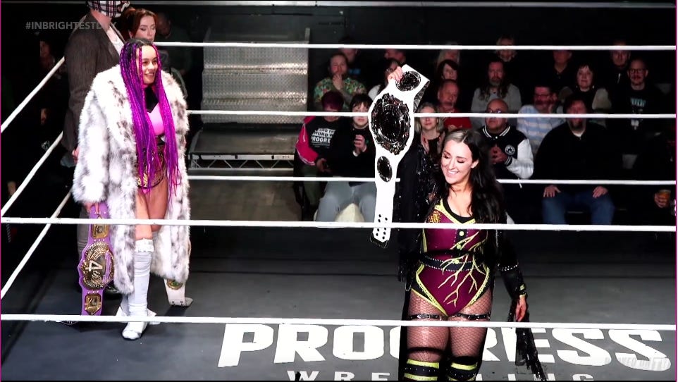 It’s important going in that you know the history and friendship between these two. Rhio comes out with her ICW, EVE, and 4th Rope titles. Falcon’s fairytale of becomign champion came true at the last chapter (and she comes out with three titles, True Grit and NGW joining the PROGRESS title). I’m sure Alexxis’ gear is a Disney reference that I am too uncultured to get. Very Northern feel to the match with Sandy Beeches as the ref.